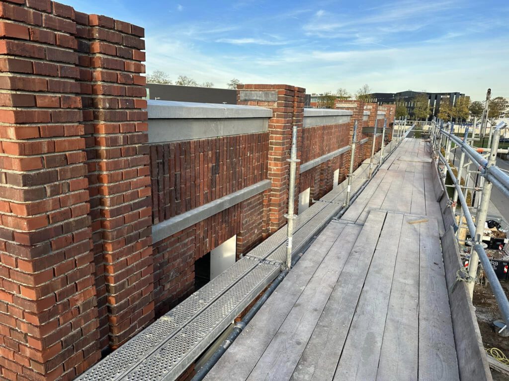 Het metselwerk is hoog! Helaas zijn de betonnen petjes voor op de torentjes nog niet geleverd. Volgende week wordt het metselwerk gevoegd. De week erop komen de aluminium kozijnen erin. Daarna kan eindelijk het steiger weg!