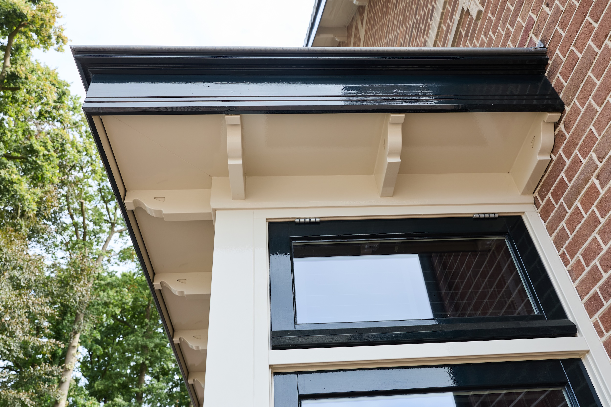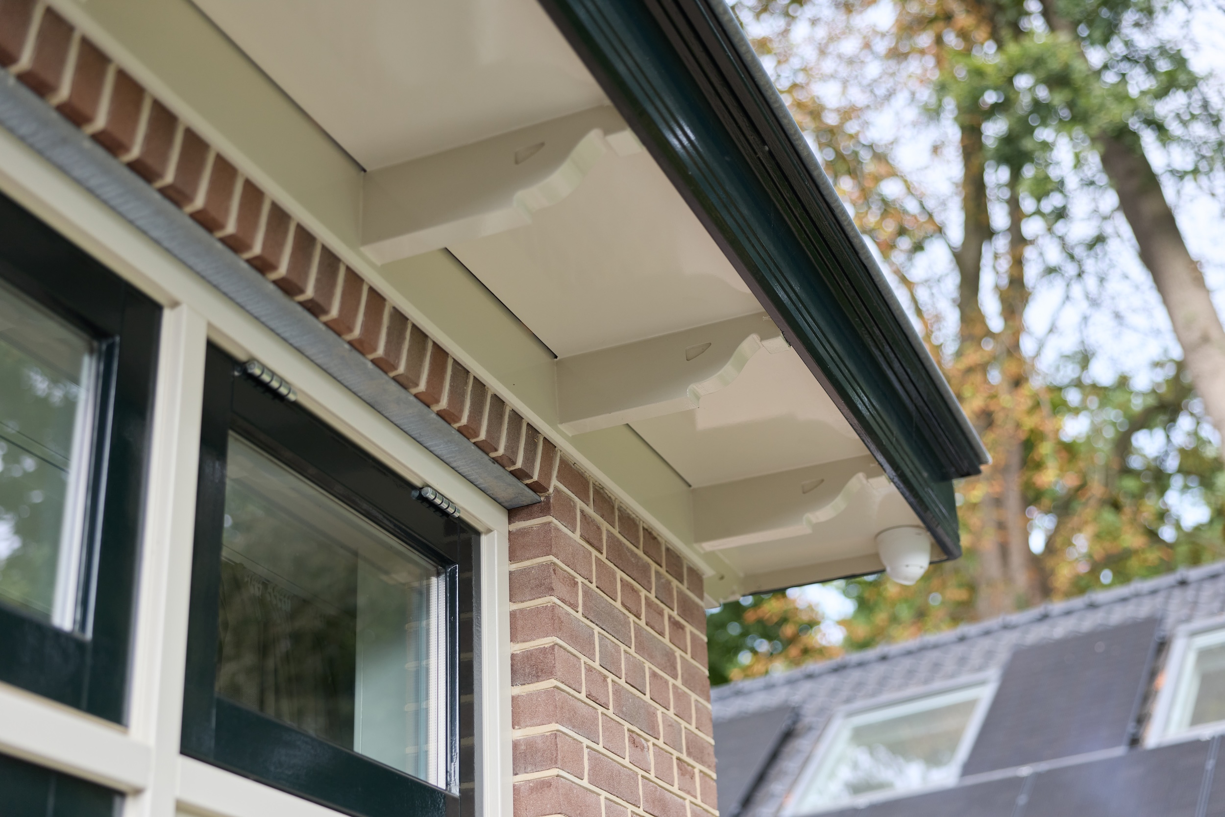 Architectonische aansluiting: boeidelen, gootlijsten en detaillering identiek aan de bestaande woning.