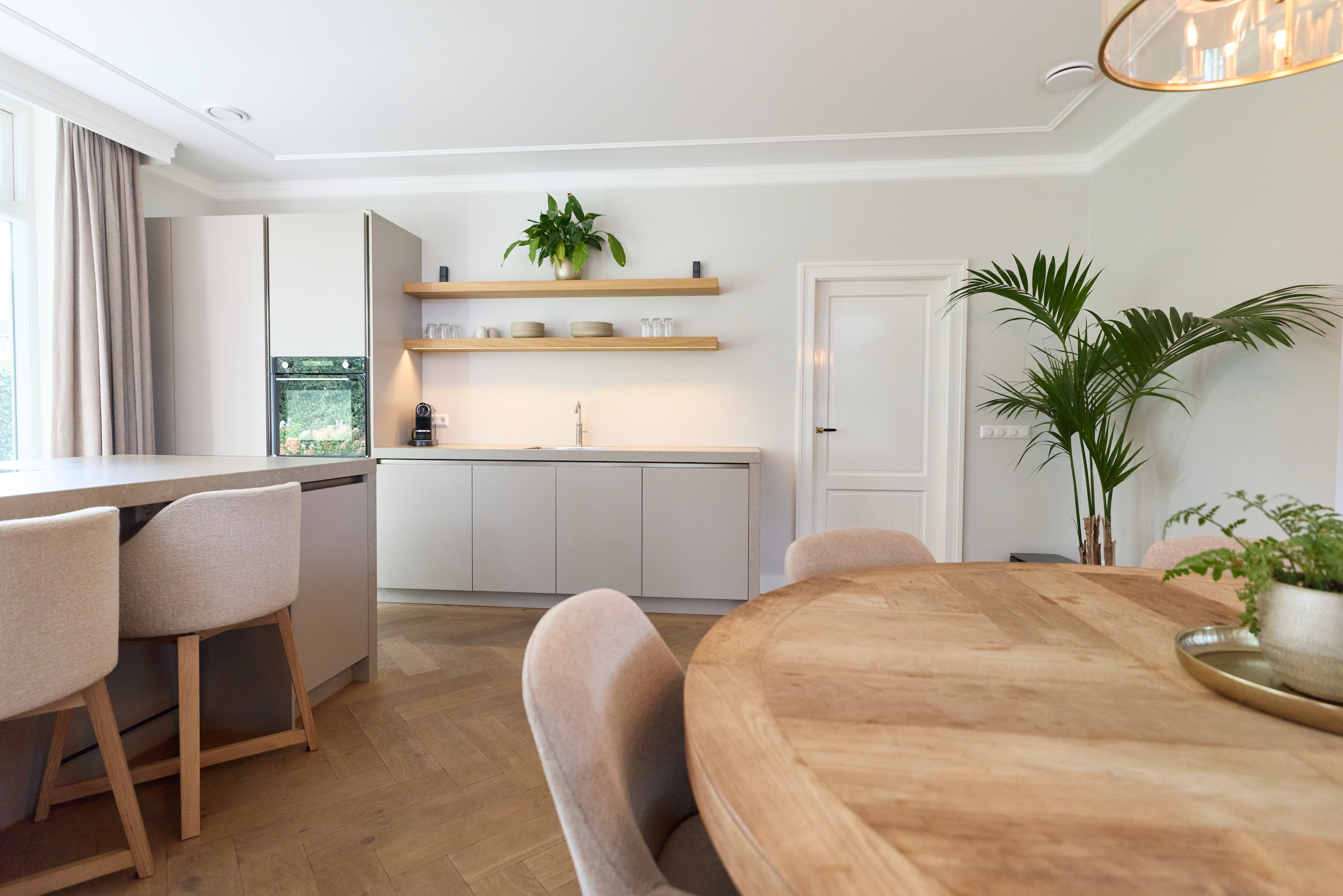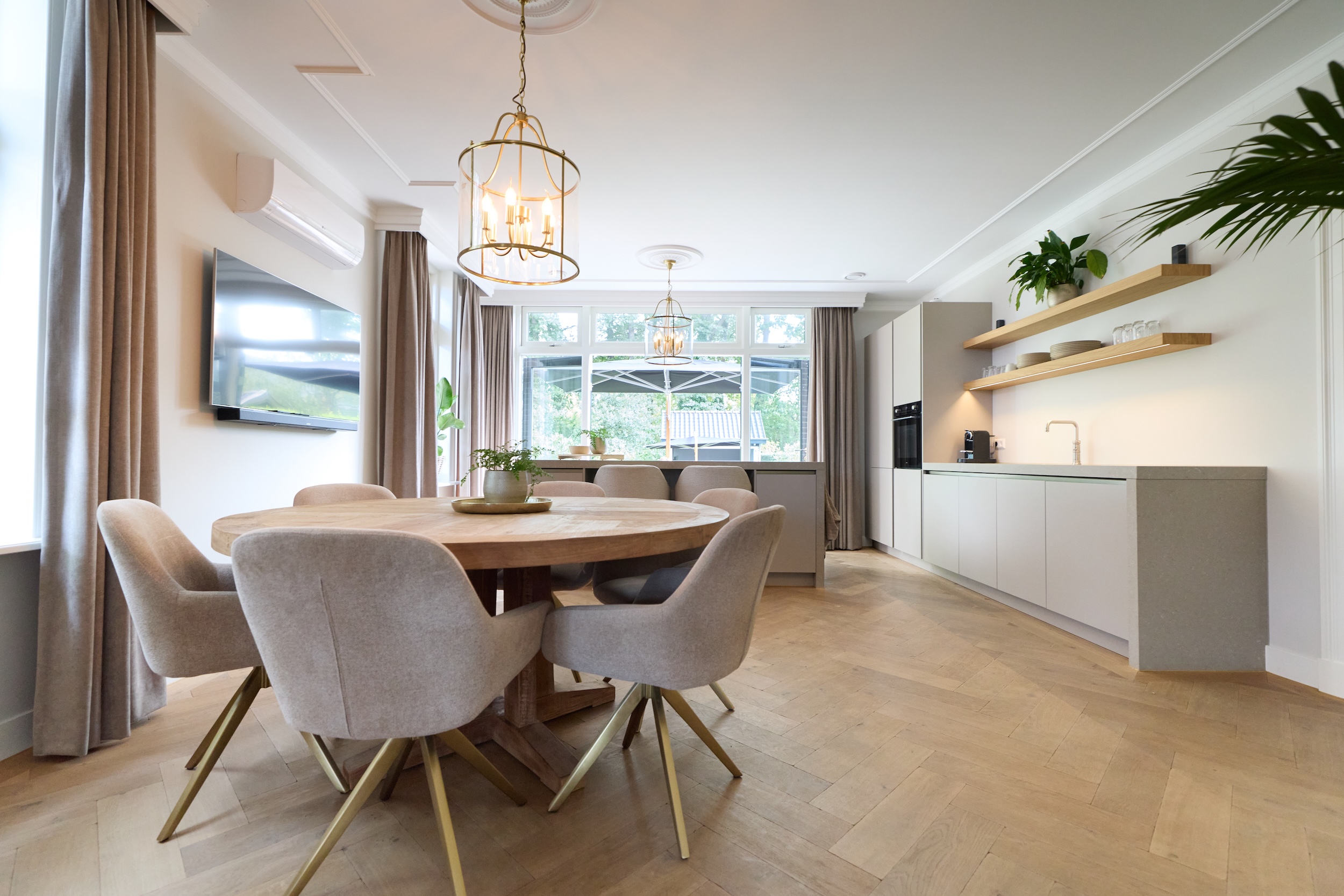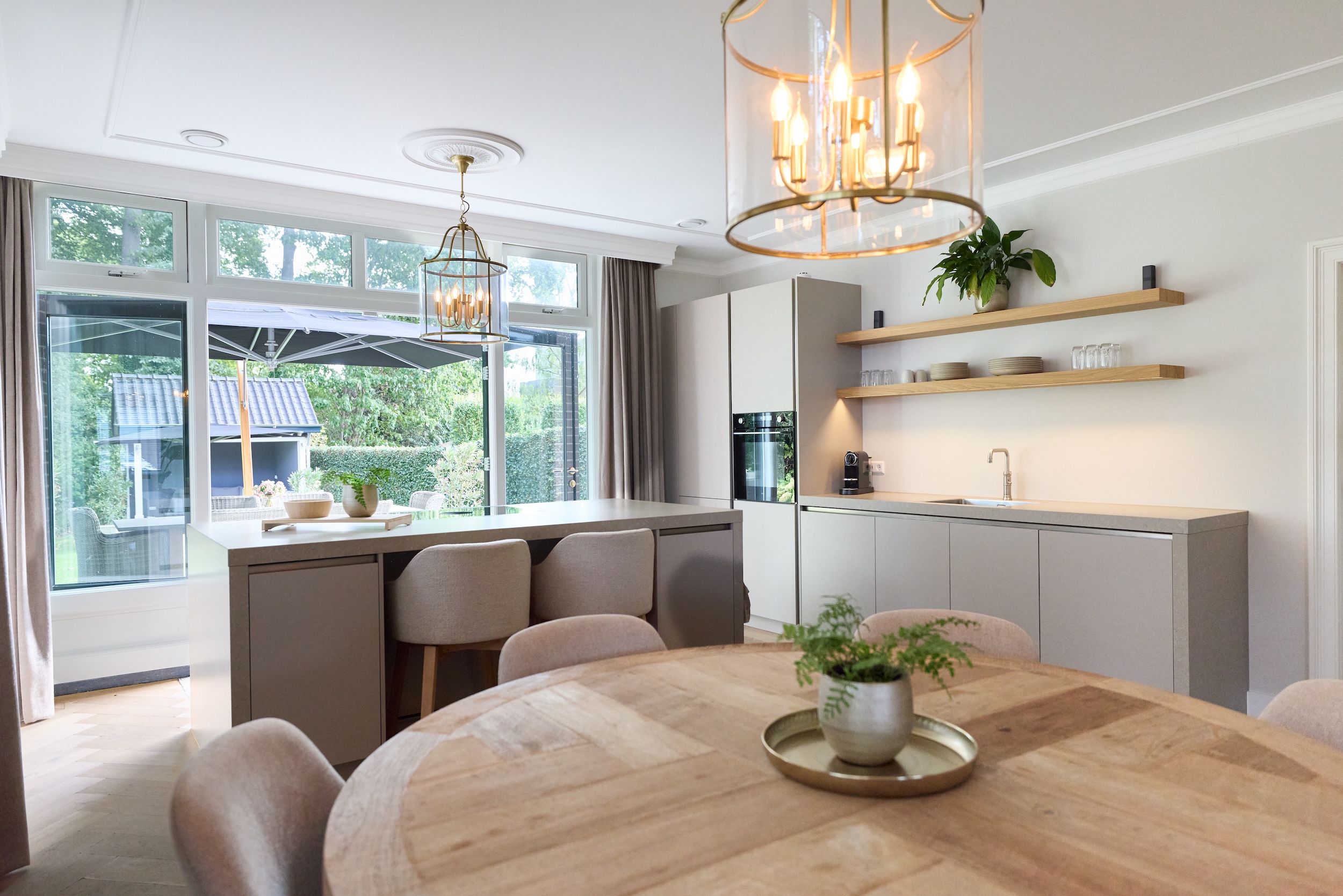 Een lichte, comfortabele leefkeuken/eetruimte die het dagelijkse wooncomfort vergroot, zonder concessies aan het karakter van 1908. Buiten sluit de nieuwe pui perfect aan op het verhoogde terras, zodat binnen en buiten logisch in elkaar overlopen.