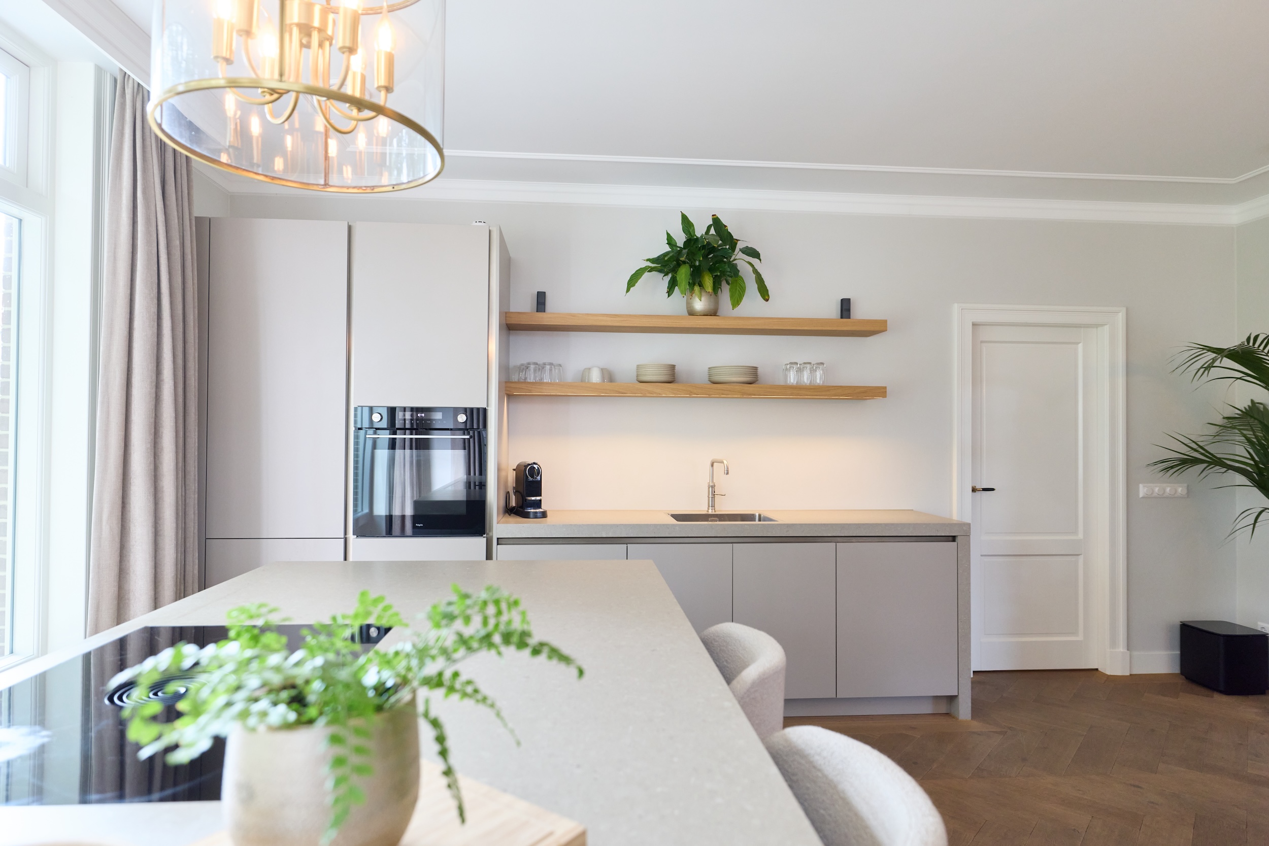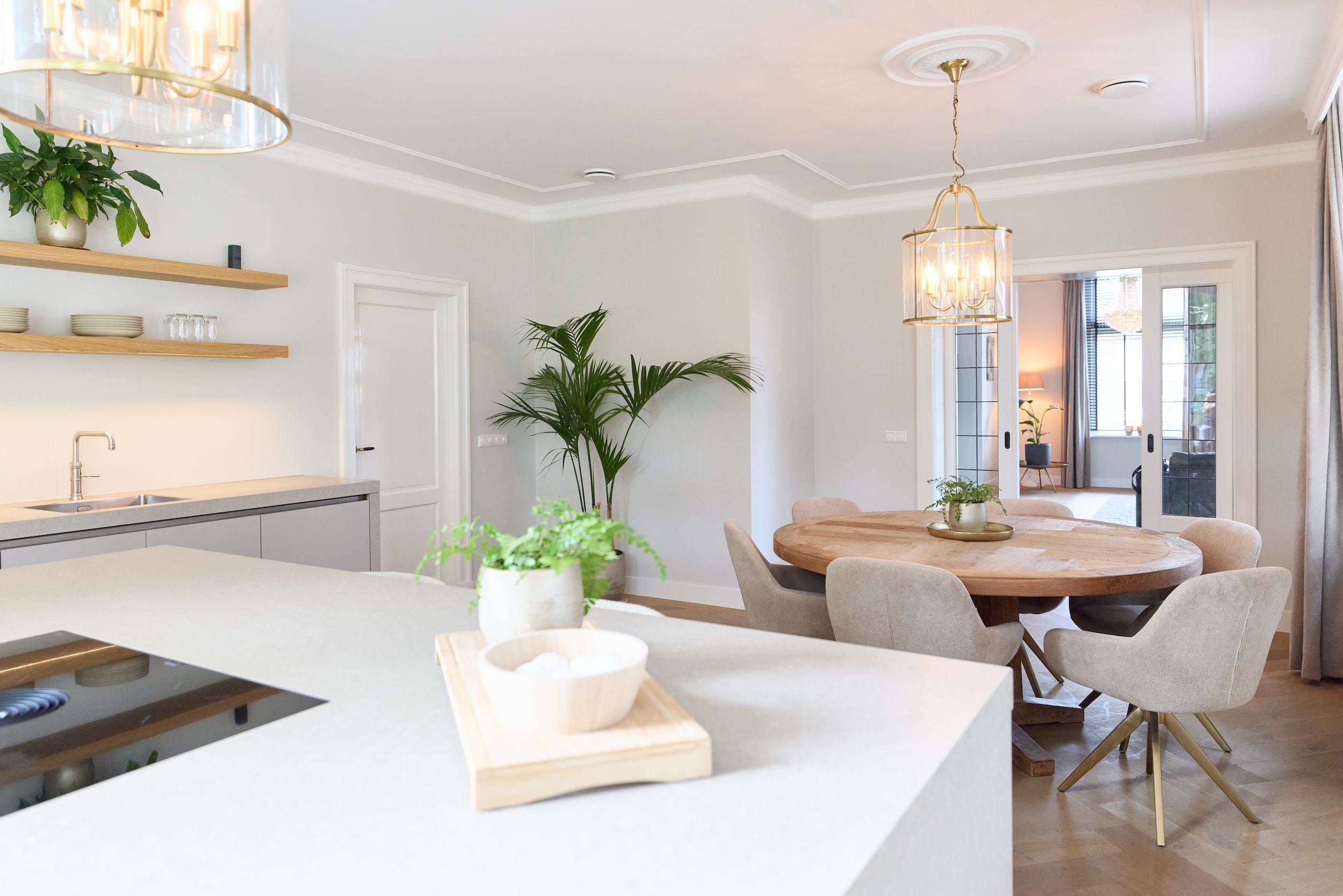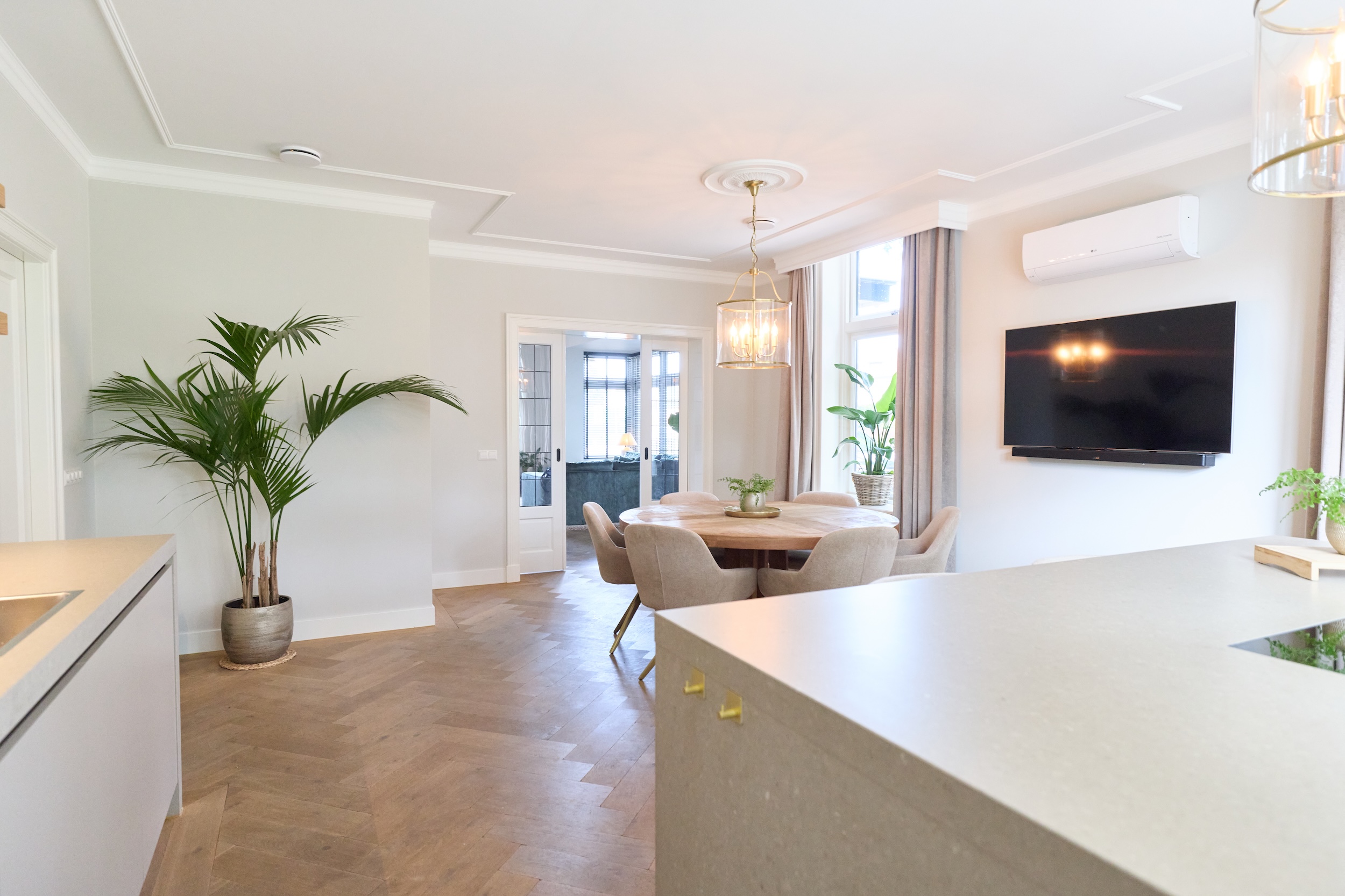 Een lichte, comfortabele leefkeuken/eetruimte die het dagelijkse wooncomfort vergroot, zonder concessies aan het karakter van 1908. Buiten sluit de nieuwe pui perfect aan op het verhoogde terras, zodat binnen en buiten logisch in elkaar overlopen.